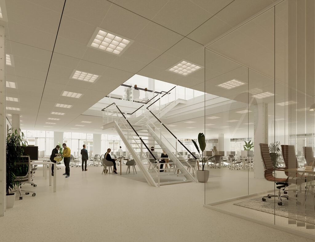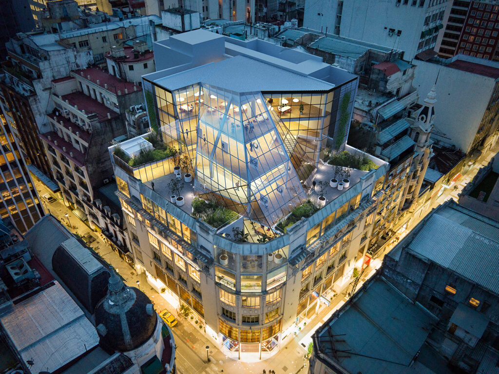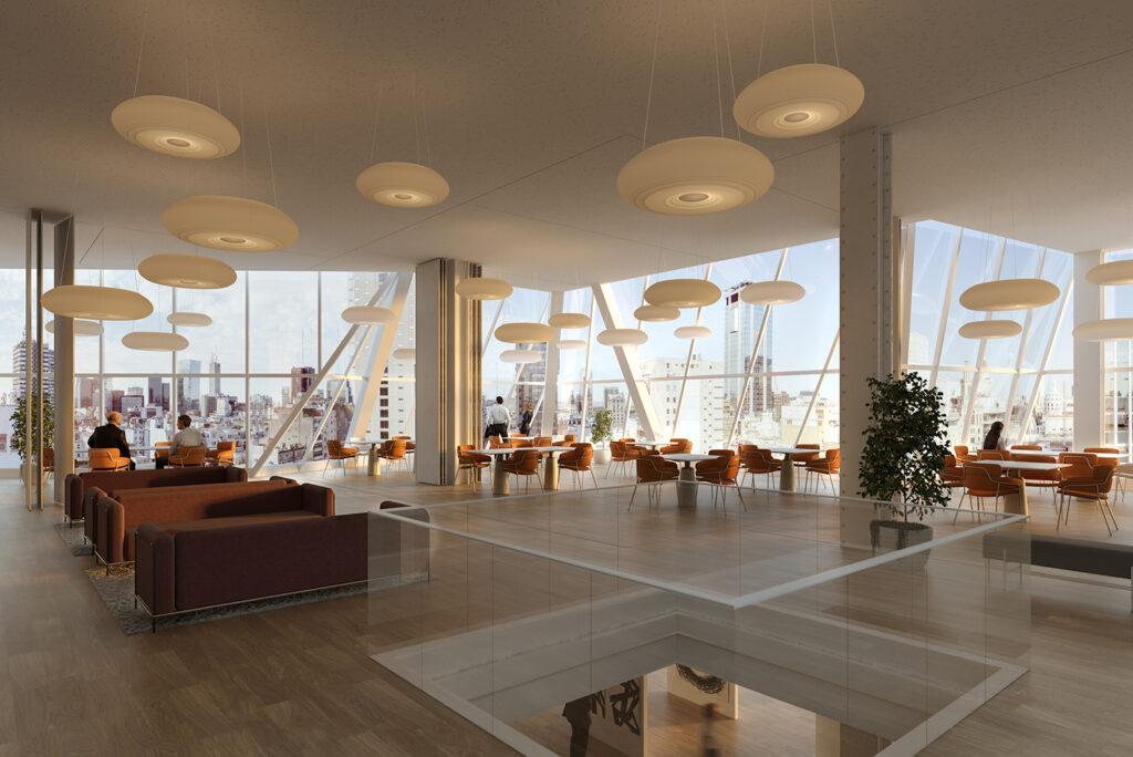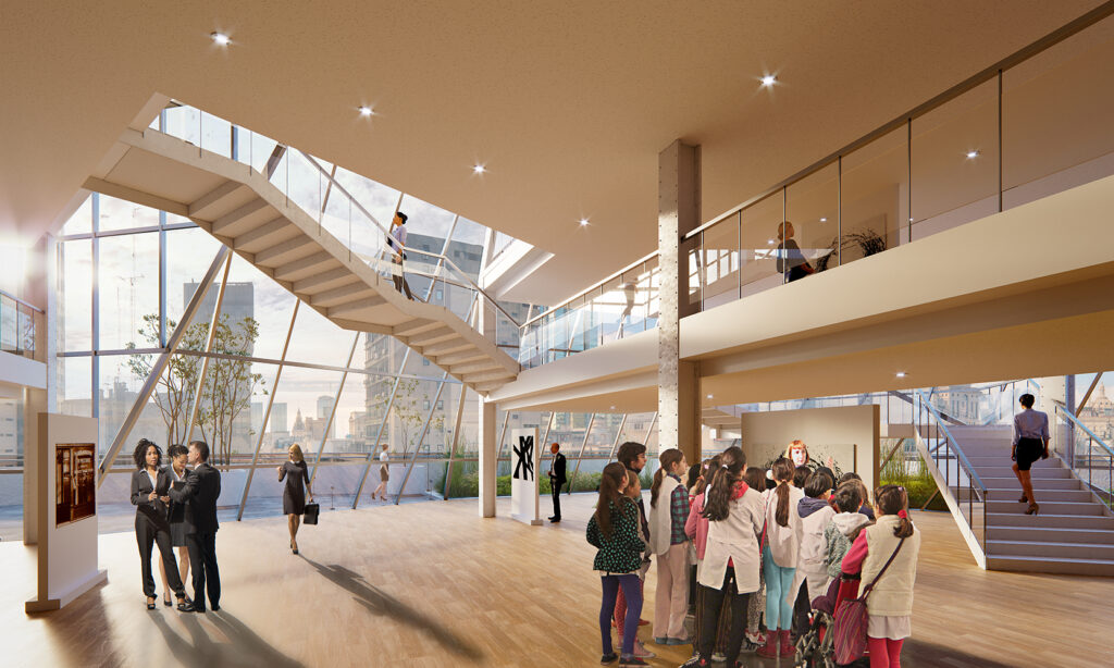 A este fin, se han organizado estos sectores dentro de una única cubierta superior contemporánea de metal y cristal (remitiendo a la cúpula histórica del edificio original perdida en el incendio de 1907), que permita alojar el programa de usos culturales y sociales en los niveles 6°, 6° bis, 7° y 8°.(Museo, Exposiciones y sumando también los Comedores de los funcionarios), en armonía con el basamento de cristal de la recientemente renovada sucursal.