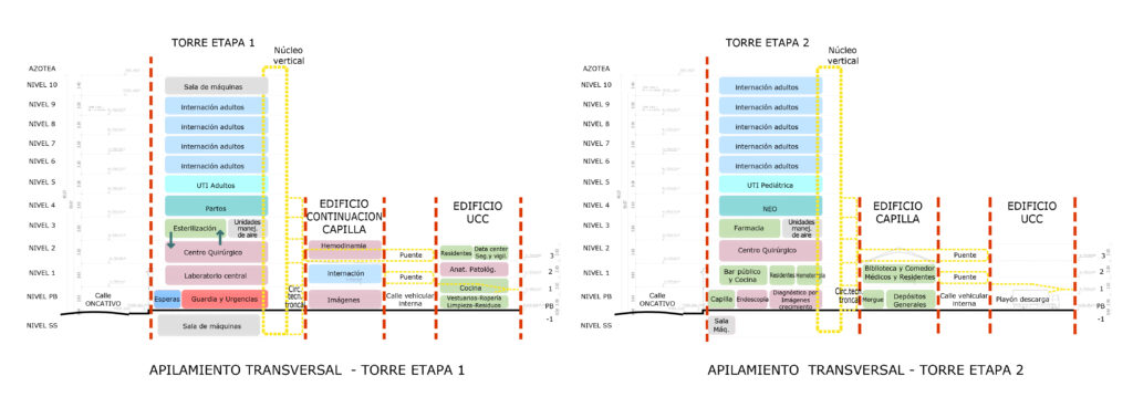 Los edificios que se preservan, se zonifican con nuevos usos y vinculaciones, conectando sus superficies preexistentes con las nuevas –Ampliación-, organizadas con criterios funcionales de respuesta rápida para el paciente y máxima eficiencia para el trabajo del personal.