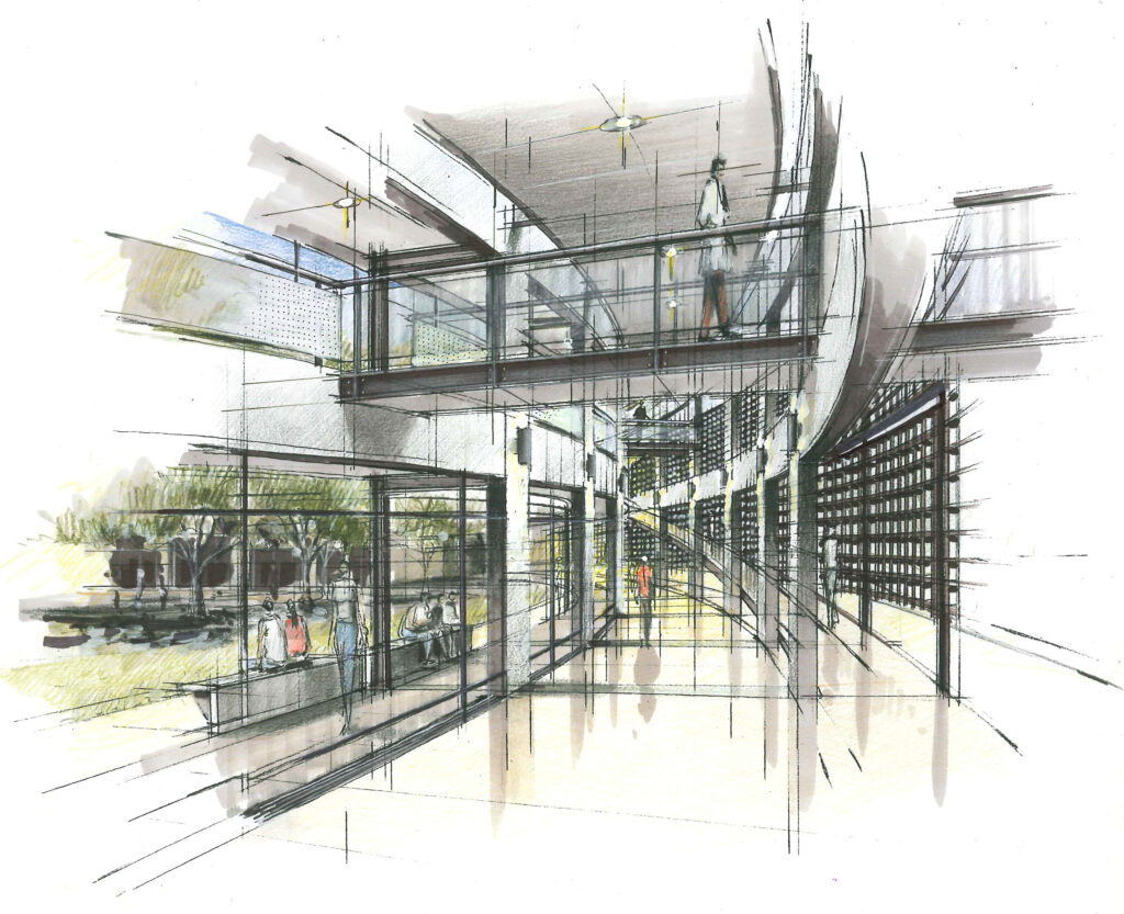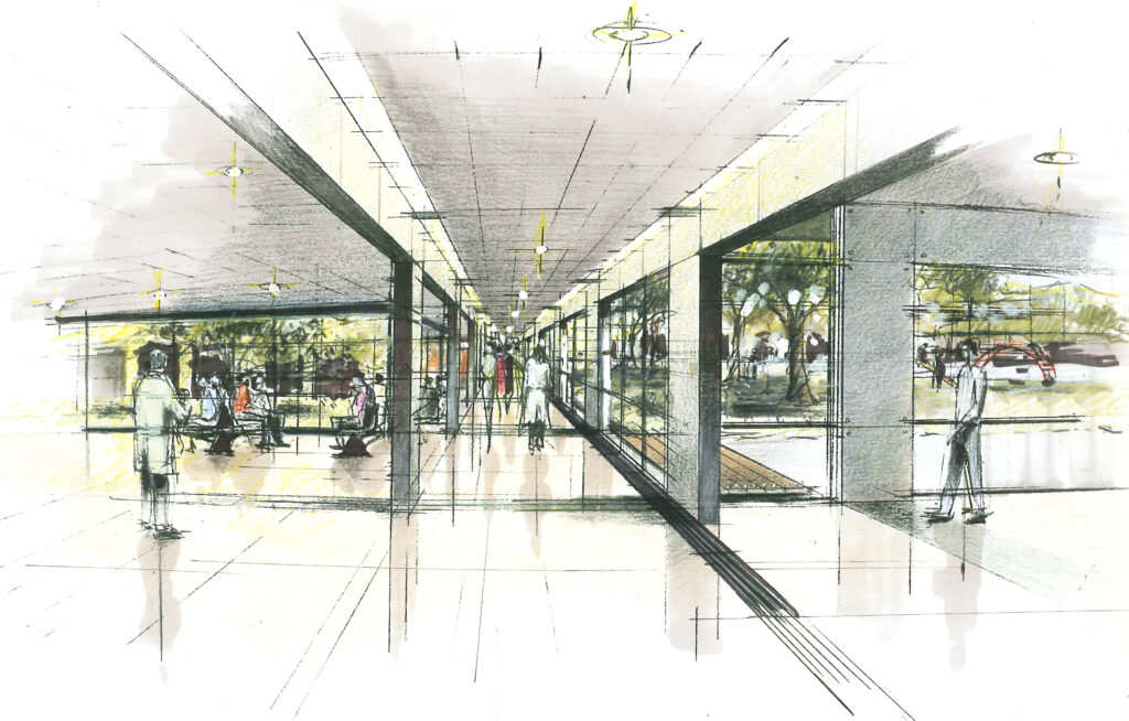 1.EDIFICIO CURVA: Un edificio conector de forma curva genera el acceso principal de público, conteniendo la plaza central, para disfrute y esparcimiento de los pacientes.