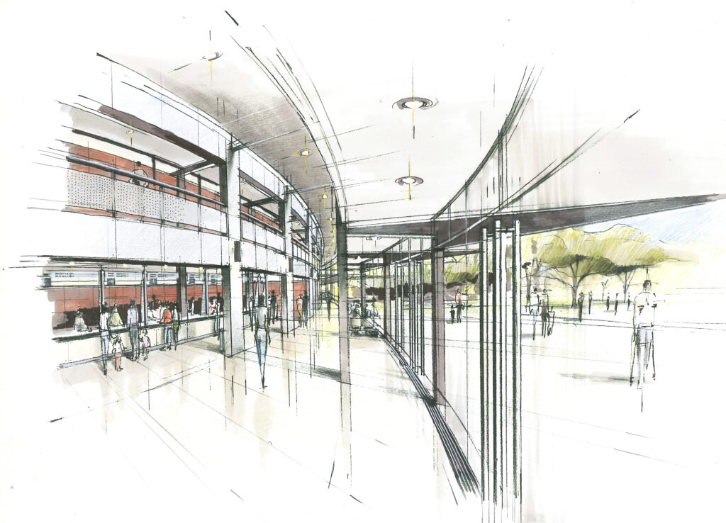 Se organizan las partes nuevas a ampliar, interconectándolas en un único conjunto con las piezas existentes, a partir de considerar que el acceso de público debe producirse por la esquina del Boulevard Rawson y Santa Fé, tomando en cuenta el plan de etapas de obra que permita el funcionamiento simultáneo. Una doble línea de eucaliptus añosos de gran porte, genera al interior del sitio una barrera verde magnífica, digna de ser contemplada para las soluciones del diseño.