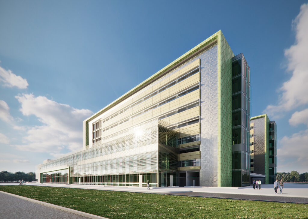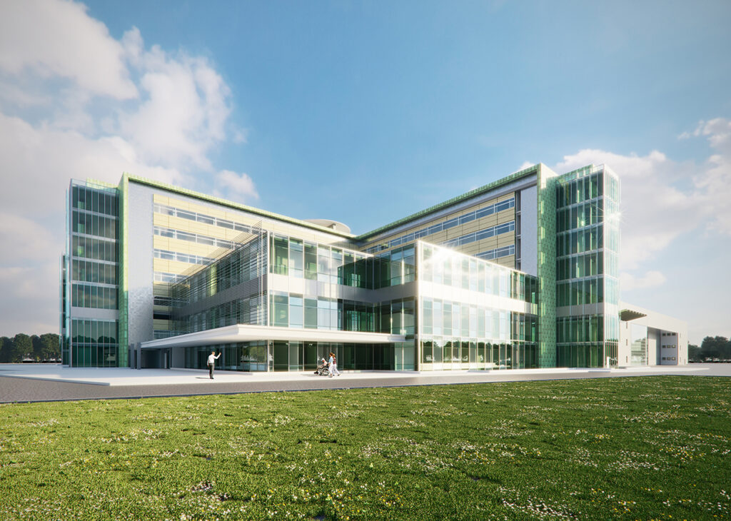 A su vez las torres de Hospitalización emergen de este gran volumen otorgándole al conjunto escala e identidad.
