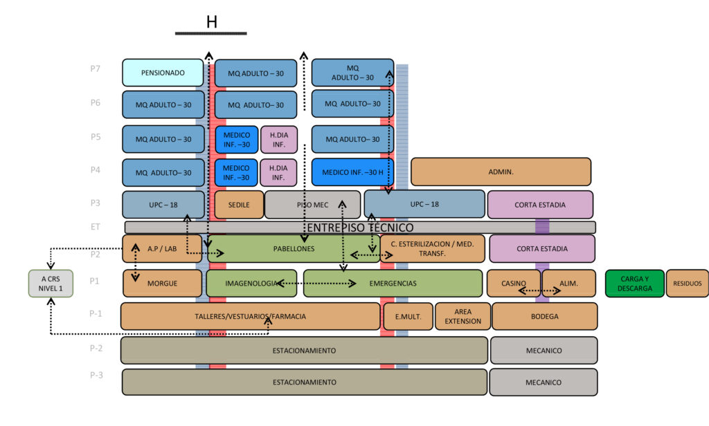 El conjunto está conformado por dos sectores diferenciados. Por un lado contemplando el edificio de Atención Ambulatoria –CRS- que no forma parte de esta consultoría. Por lo tanto se ha desarrollado el Hospital complementándose con el CRS, conformando una plaza central que provee vistas e iluminación al conjunto en su totalidad. El basamento del edificio hospitalario donde se ubican las funciones relacionadas con Diagnóstico y Apoyo Clínico toma la misma altura del CRS, delimitando volumétricamente la plaza central articuladora.