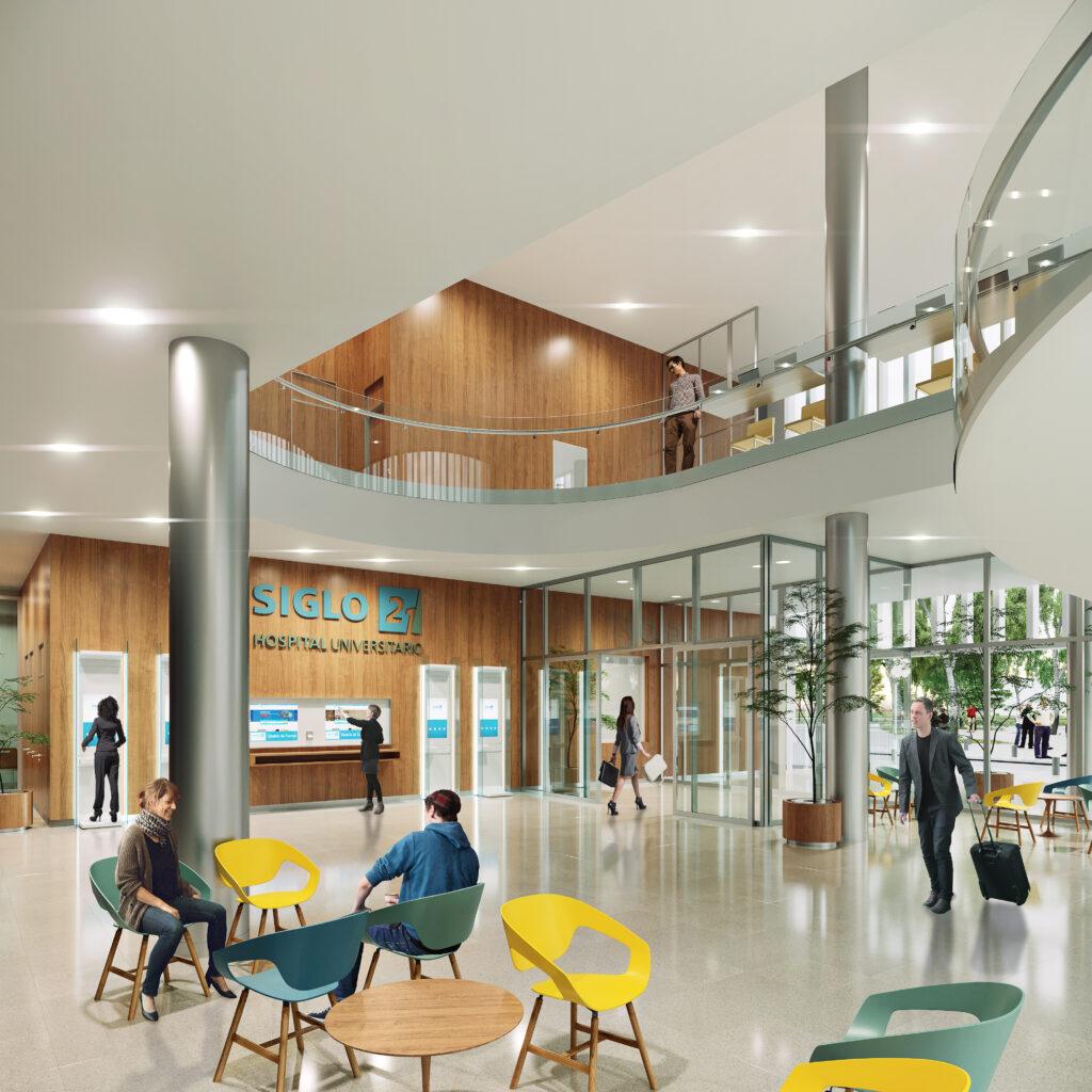 El HUS 21 se ubica contiguo al Campus de la Universidad Siglo 21 en la Ciudad de Córdoba. El edificio se ha estructurado como dos volúmenes cúbicos “articulados” por una “pieza” conectora con espacios de público, personal y servicios en sus diferentes niveles:
