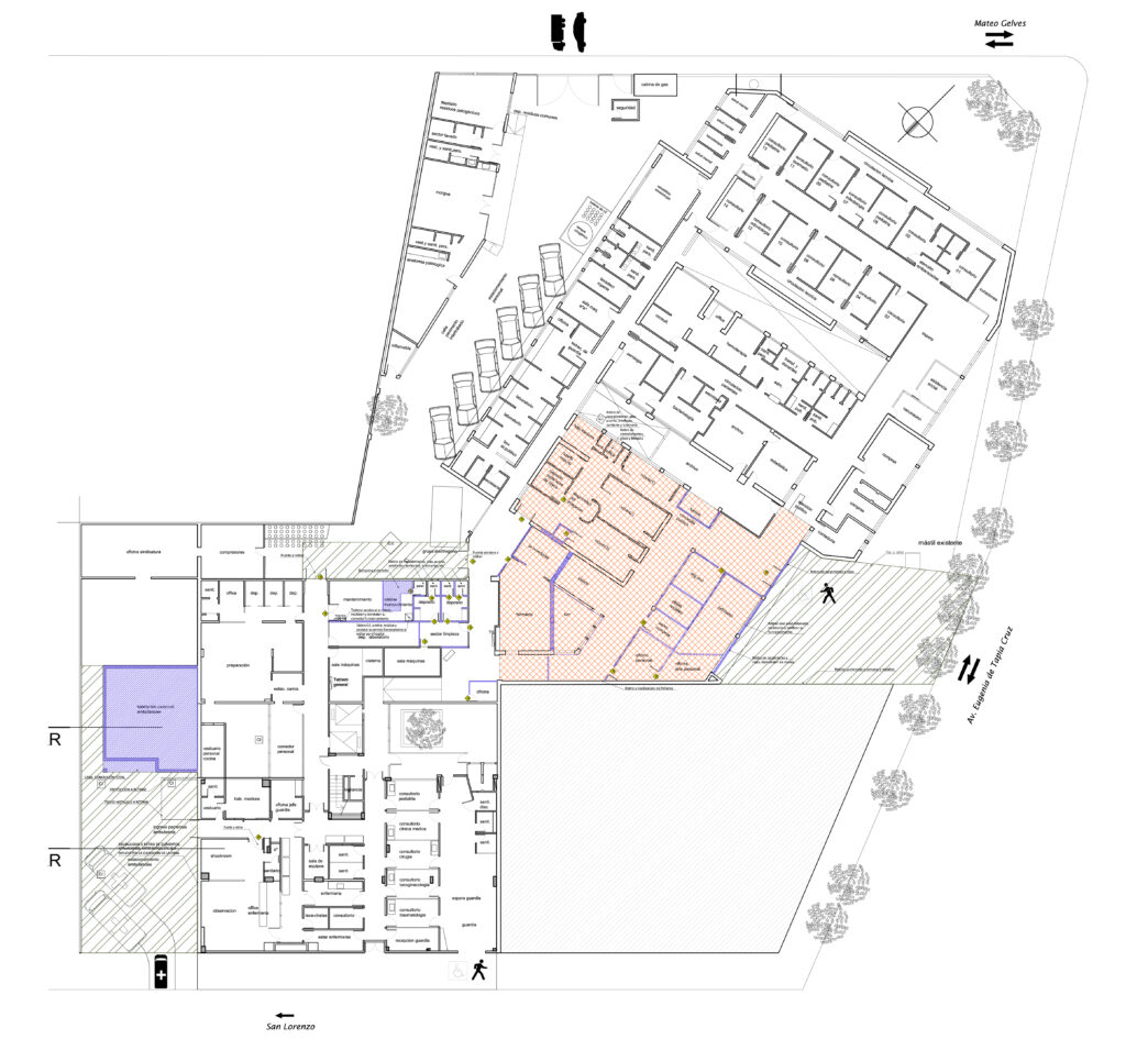 Hall de acceso, Diagnóstico por imágenes (instalación de Tomógrafo y Mamógrafo), Farmacia, Observación de Guardia, UTI, UCI, Circulación técnica interna y Centro de Trauma.