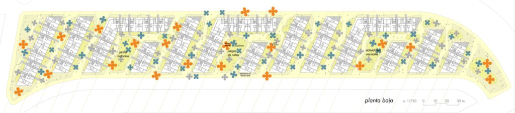 La situación urbana pasante de las unidades, conecta ambas calles y organiza plazas públicas a escala barrial para los habitantes del complejo. Las unidades se desarrollan en PB más 2 niveles, en una superficie de 70m2 por unidad.